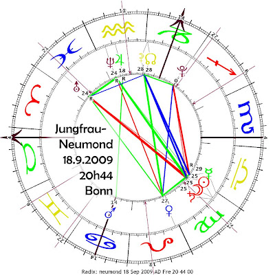 Aus diesem Horoskop, dem Zeitpunkt des Neumondes morgen, weht einerseits überall das Wort „harte Realität“ hervor (Das Element Erde, der Planet Saturn extrem angesprochen), andererseits die Themen „neu“ und „Mißverständnis“… Ganz oben, links neben dem Pfeil, der nach oben zeigt, sind zwei gelbe Zeichen… Mondknoten und Lilith. Der Ort, wo die beiden stehen, heißt „dies ist das Prüfungsthema“… Mondknoten und Lilith haben gemeinsam: „extrem wichtig“ und „nicht so leicht zu greifen“. Ausformuliert würde ich sowas sagen wie: Bewußtseins-Entwicklung ist das Wichtigste und gleichzeitig fast nicht zu sehen (als so „verdeckt“ deutet man Lilith).